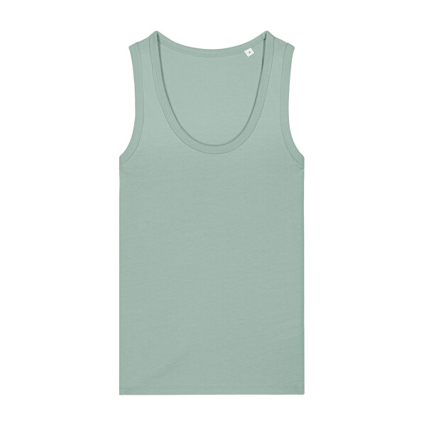 The Stella Ava fitted tank top for women. Sleeveless. 1x1 rib binding at collar and armhole. Overlock at back neck. Twin-needle topstitches at hem.