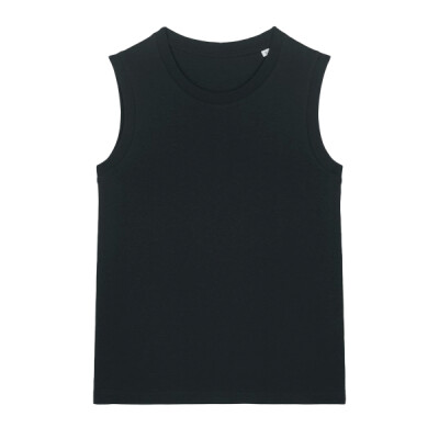 The Stella Mia tank top for women. Medium fit. Sleeveless. 1x1 rib at collar and armhole. Back neck tape in self-fabric. Twin-needle topstitches at hem.