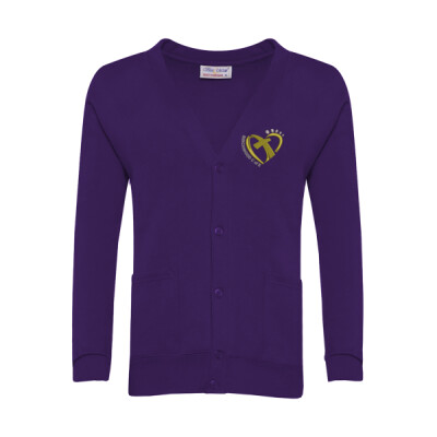 Description: Drop shoulder sweat cardigan. Ribbed welt and cuffs. Two patch pockets. School logo embroidered left breast.