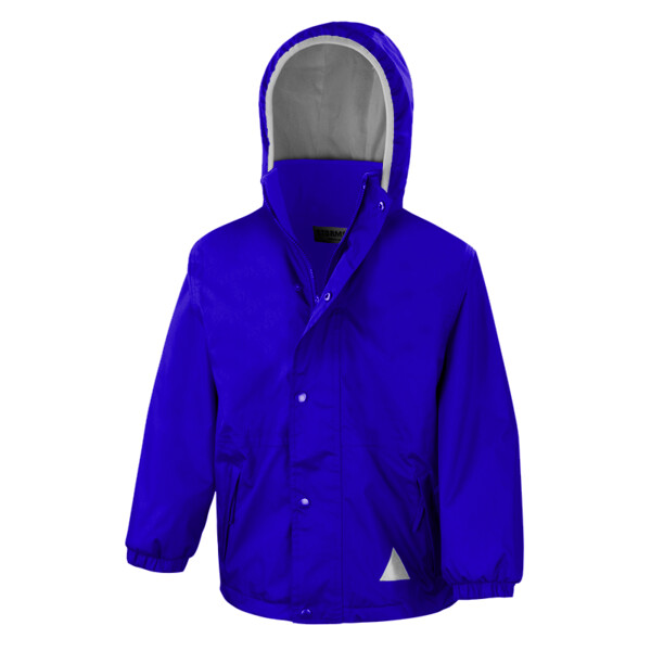 Description: PVC coated StormDri 4000 polyester with pill resistant polyester Active Fleece reverse. Waterproof with taped seams. Windproof. Double stitched seams. Concealed, adjustable fleece lined hood. Full length zip with studded storm flap. Two front zip pockets. Triangles incorporating 3M™ Scotchlite™ reflective materials. Elasticated cuffs.Cut out label (some colours in transition). Tear release access for decoration.